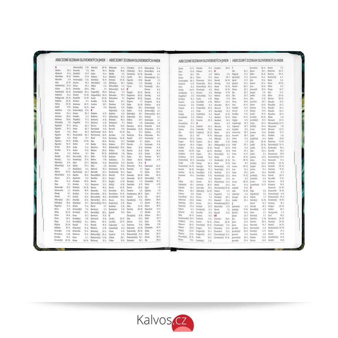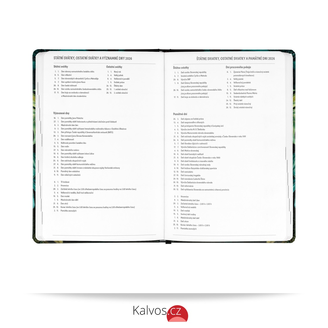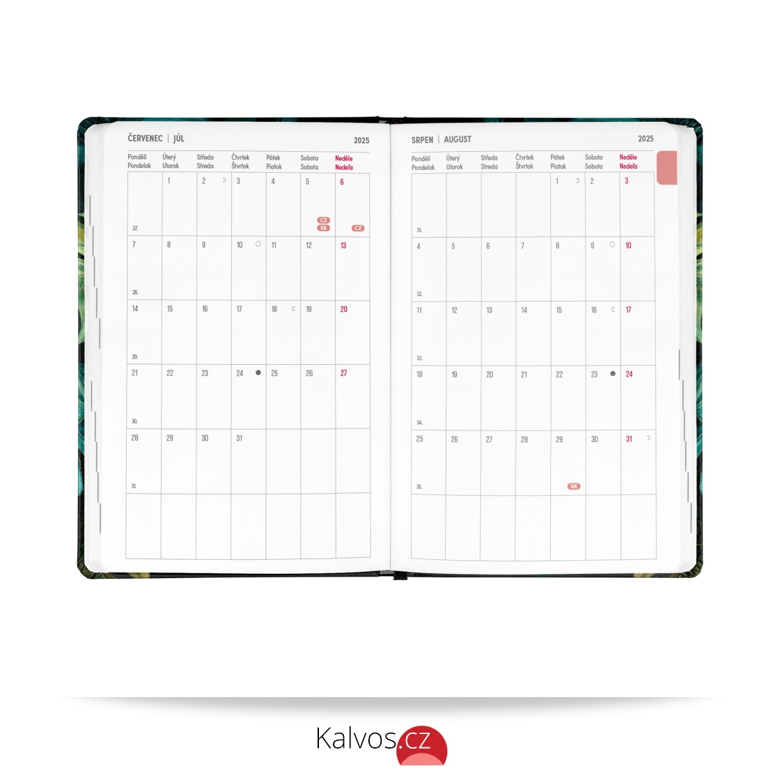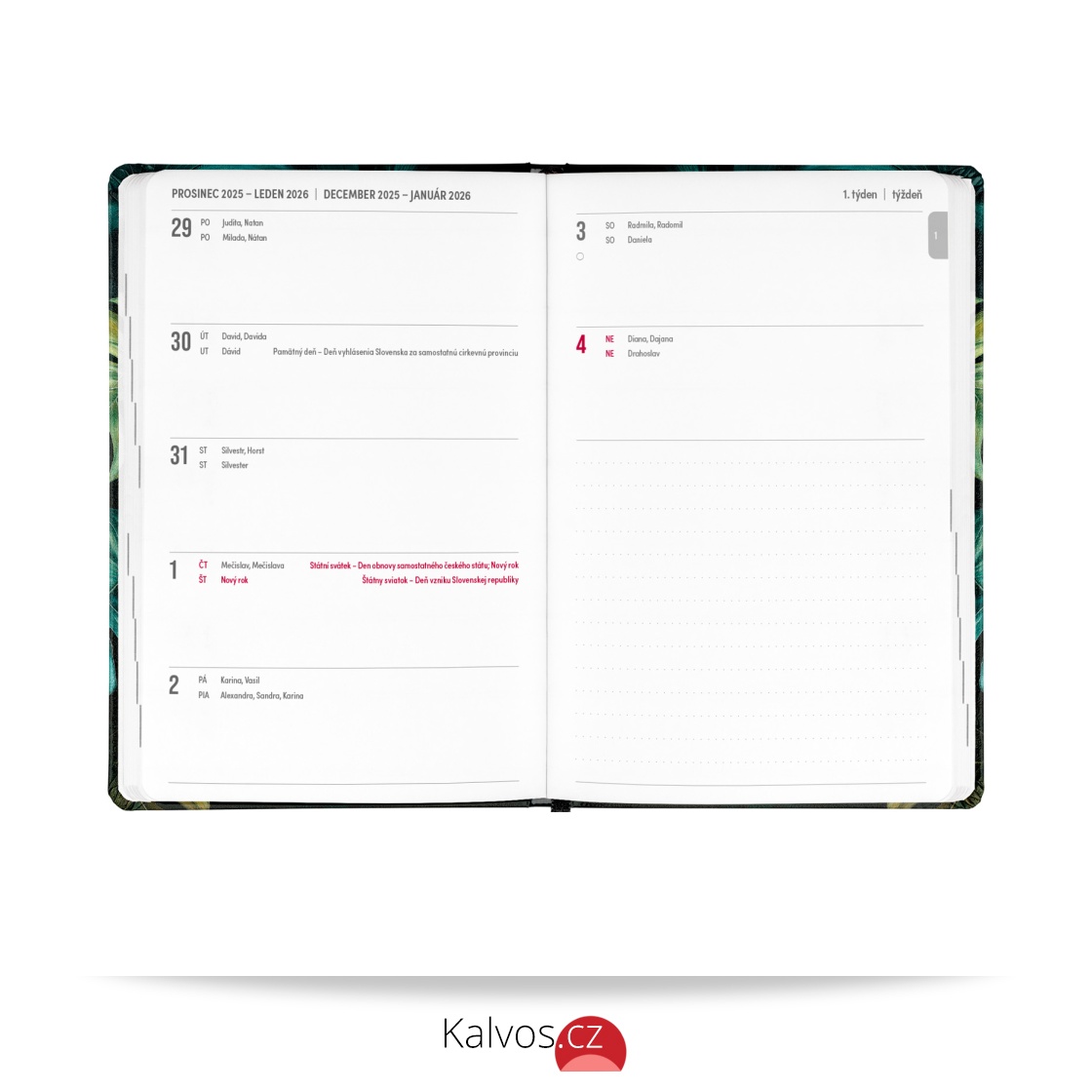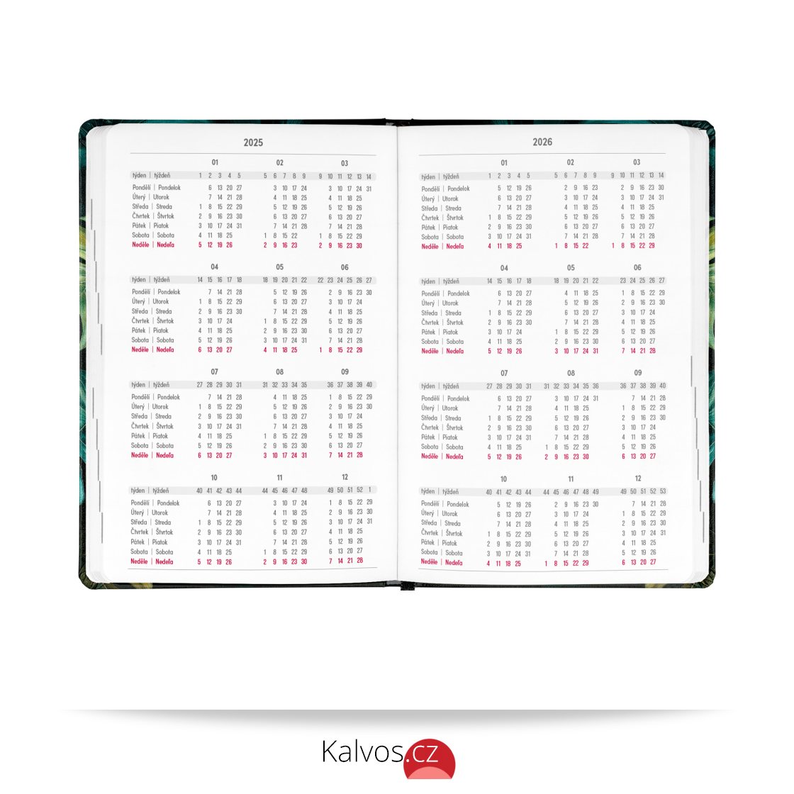 Osmnáctiměsíční diář obsahuje přehled na rok 2025 a 2026, seznam českých a slovenských jmen, česko-slovenské týdenní řádkové kalendárium se jmény a svátky a prostor na poznámky. Kalendárium začíná v červenci 2025 a končí v prosinci 2026.