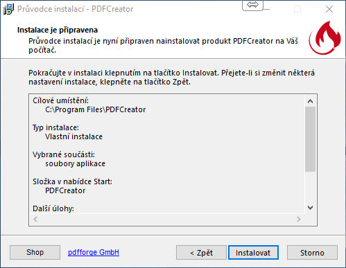 5. Následuje souhrnné okno, kde jsou informace o složce, kam se program nainstaluje a další informace. Dále klikněte na Instalovat Souhrn instalace