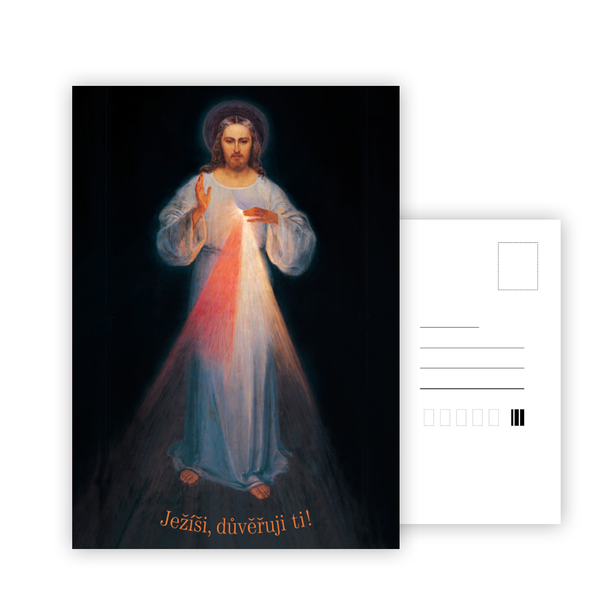 Klasická pohlednice, s motivem Božího milosrdenství, kterou můžete poslat svým blízkým. Na rubové straně jsou předtištěny linie pro zadání adresy a pro nalepení známky.
