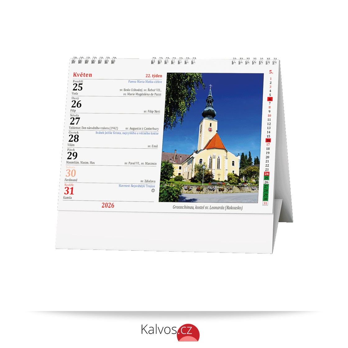 Stolní kalendář s týdenním katolickým a občanským kalendáriem s obrázky kostelů a kapliček.