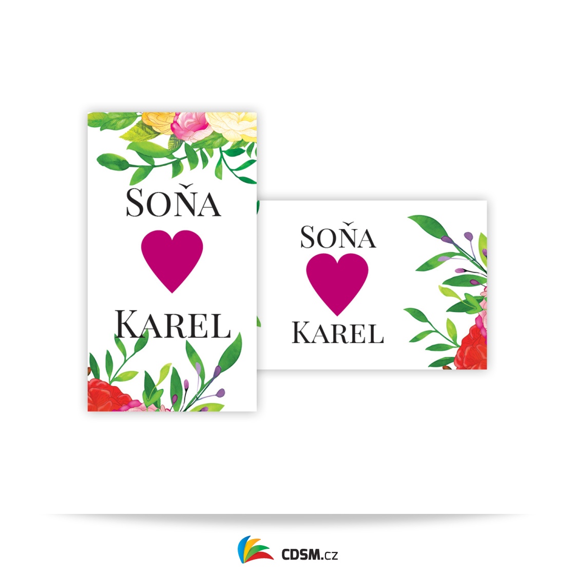 Malé svatební samolepky o formátu 60 x 34 mm. Hodí se buď k nalepení na balíčky s dárky, či různá označení. daljí využít i jako jmenovky na šaty a saka či košile. Praktické použití