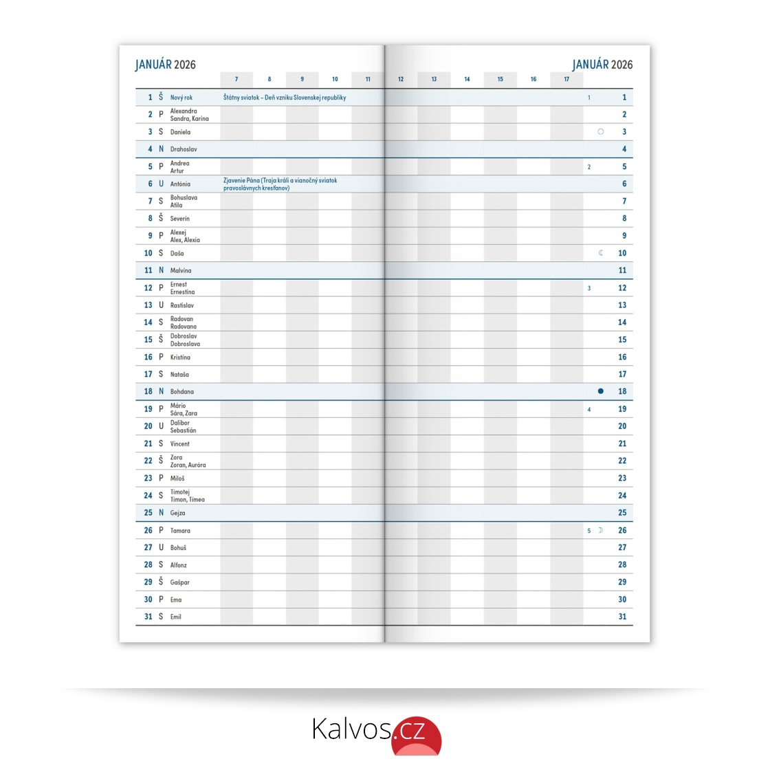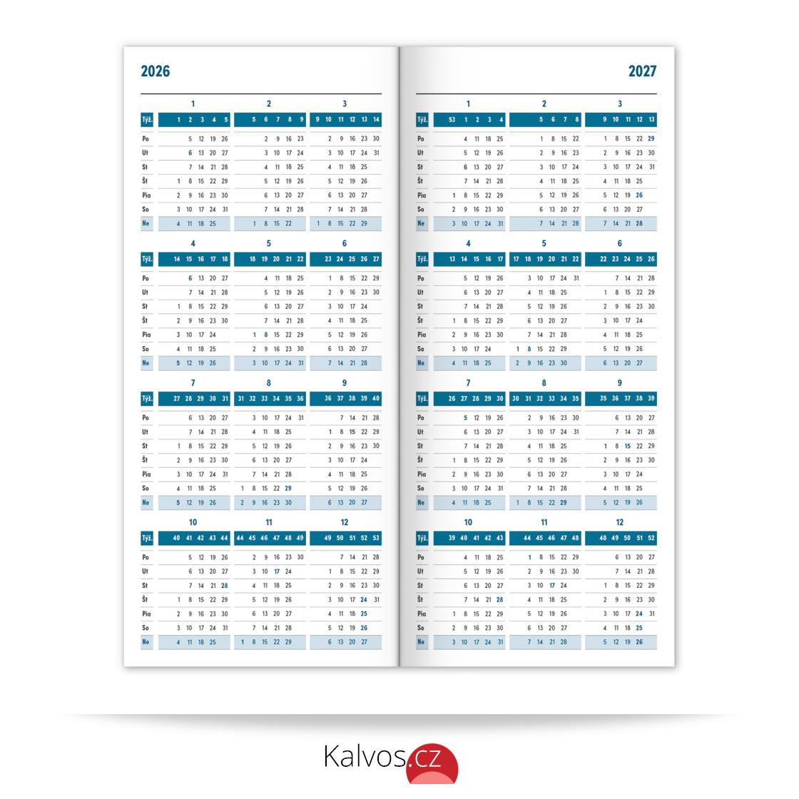 Praktický tenký diář v modré barvě s měsíčním rozložením se vejde opravdu všude. Obsahuje slovenské kalendárium se jmény, svátky a památnými dny, pracovní kalendář, seznam jmen a přehled na rok 2026 a 2027.