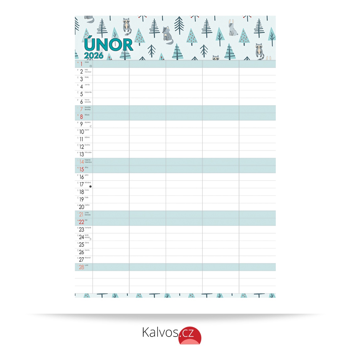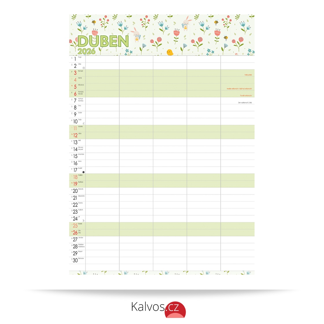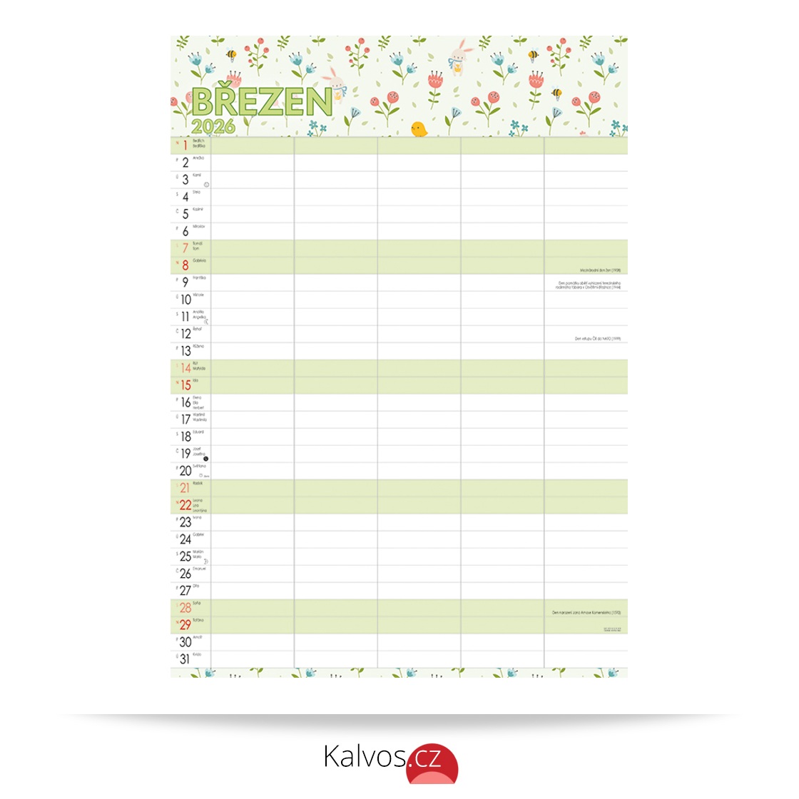 Přehledný nástěnný kalendář pro to správné rodinné plánování. Na zadním kartonu prostor na zapsání jmen jednotlivých členů rodiny (nemusíte přepisovat jména na každý měsíc) a velký prostor na poznámky.
