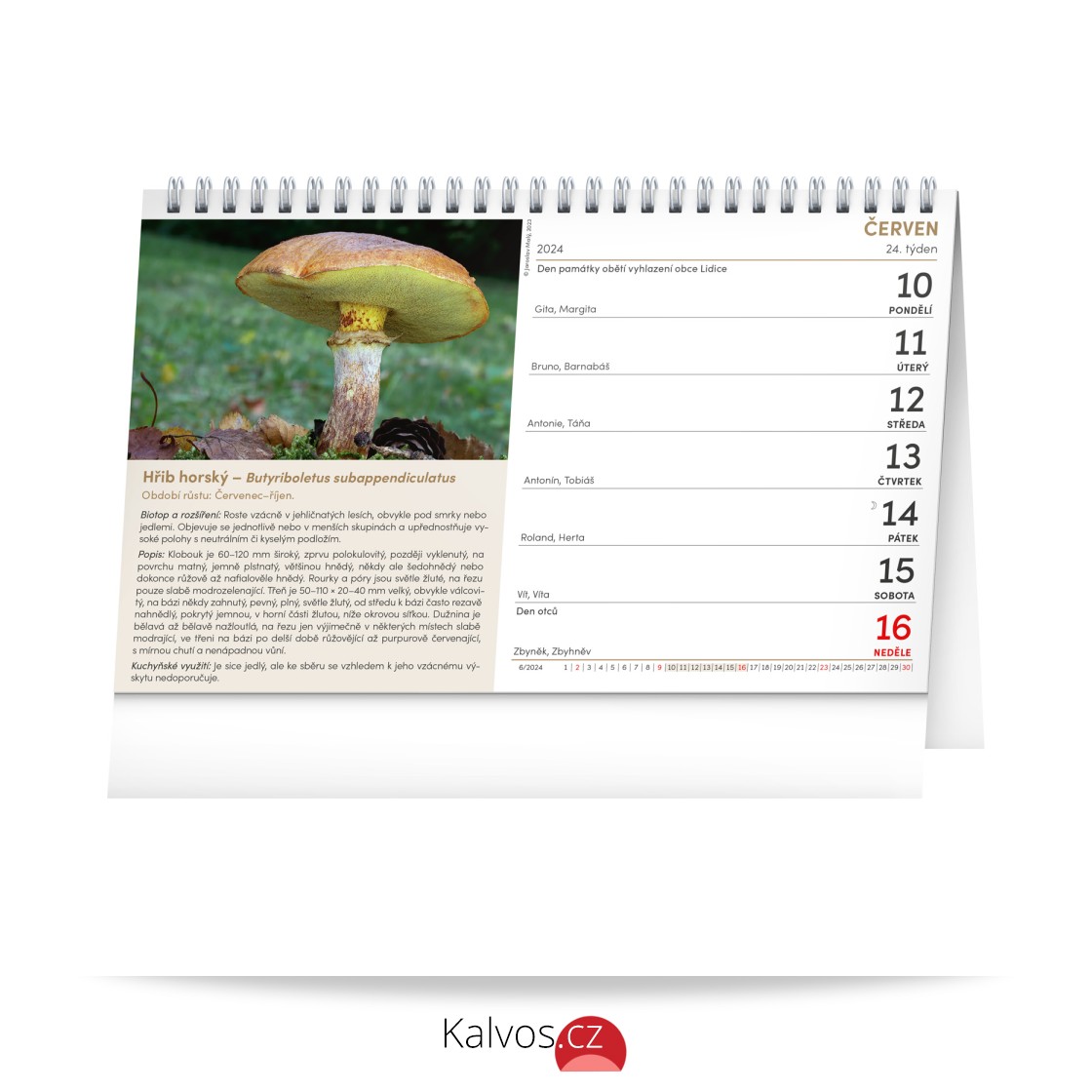 Houbařský kalendář je ideální pro všechny nadšené houbaře. Najdete v něm známé i méně známé druhy hřibovitých hub, popis jejich biotopu, kuchyňské využití a vliv na zdraví. Texty a fotografie připravil odborník a mykolog Jaroslav Malý. Stolní kalendář s českým kalendáriem obsahuje svátky a památné dny, měsíční fáze a přehled na celý rok.