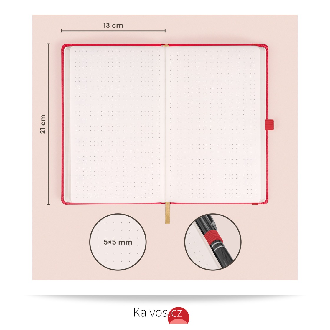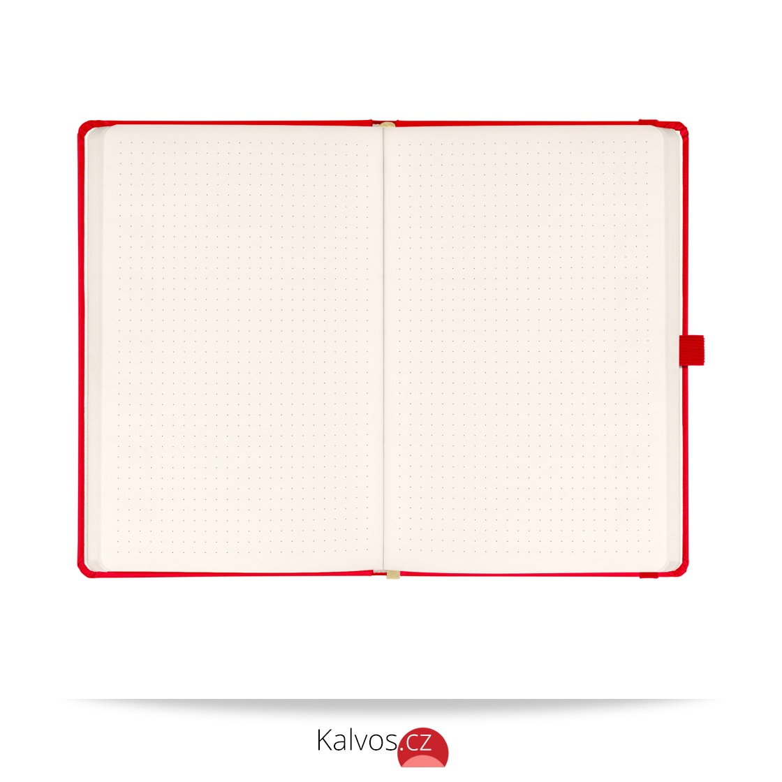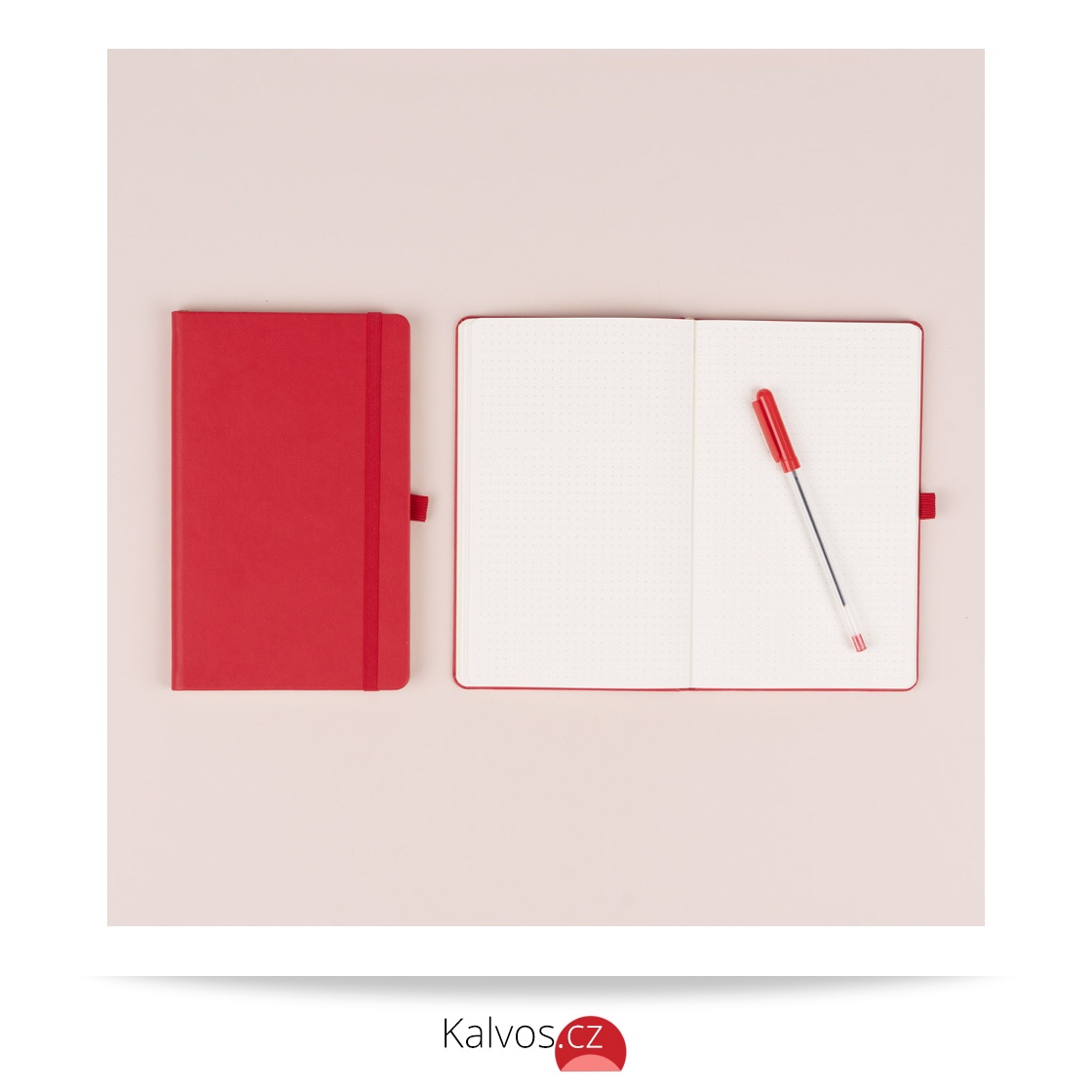 Praktický a lehký tečkovaný notes v klasické červené barvě má povrch s hrubší strukturou, na který si můžete nechat vyrazit logo společnosti. Notes má pevnou knižní vazbu a zakulacené rohy, poutko na tužku, elastickou gumičku a textilní záložku. Tečky mají 5 mm a jsou na kvalitním žlutém papíře.