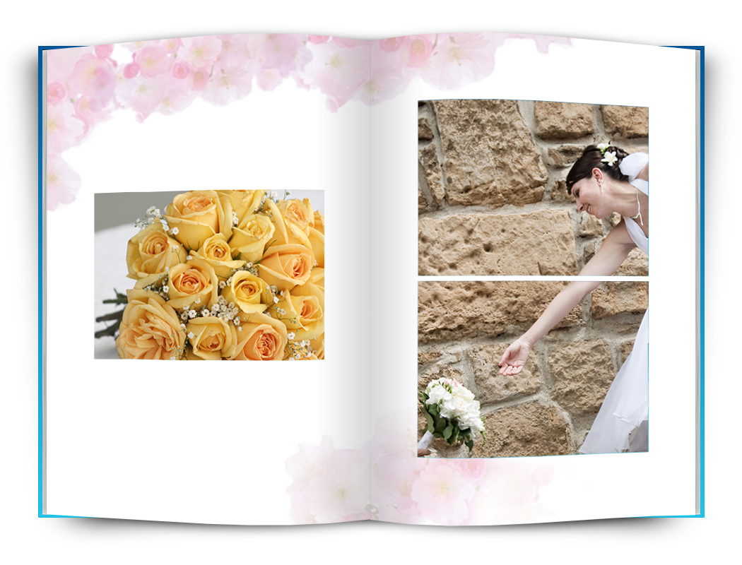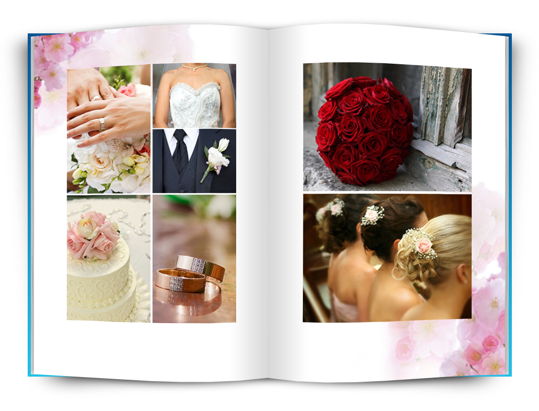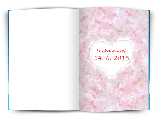 Připravená svatební fotokniha, s decentním podkladem a širokou škálou připravených rozvržení fotografií na stránkách.