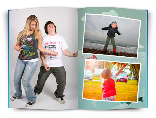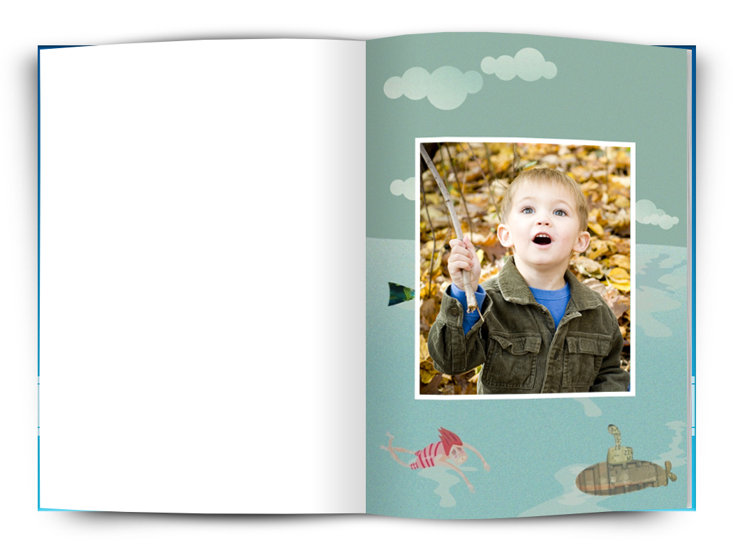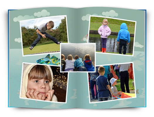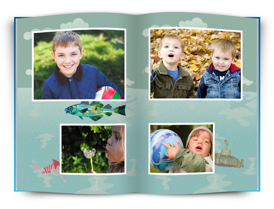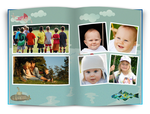 Decentní fotokniha pro Vaše ratolesti. Pěkné kombinace rámečků a pozadí pro Vaše fotografie.