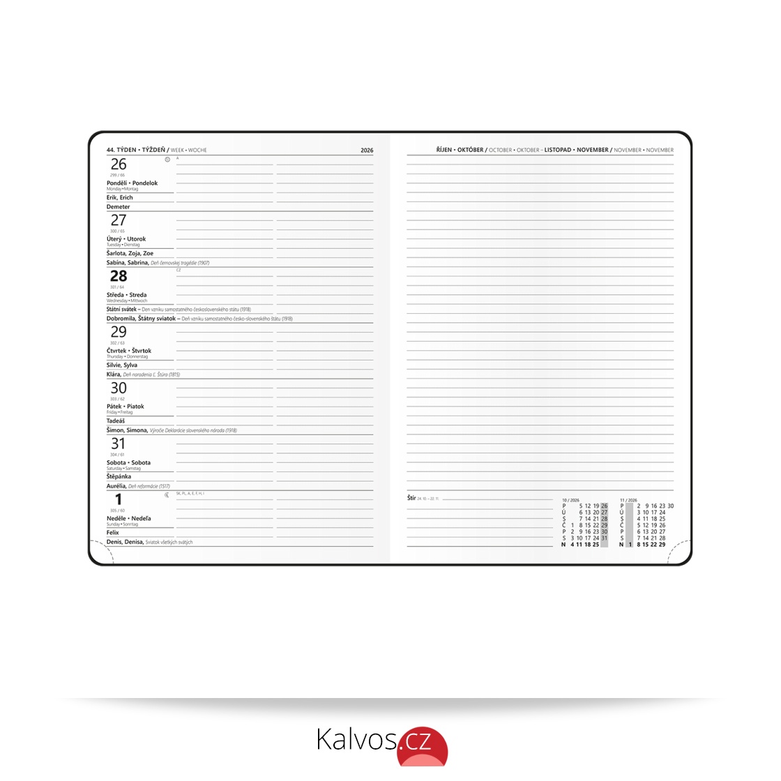 • měsíční fáze, roční období, letní a zimní čas, znamení zvěrokruhu, odpočet dnů, měsíční tabulkový kalendář, dny a měsíce v jazycích - CS, SK, EN, DE, mezinárodní svátky: CZ, SK, A, D, PL, H, GB, E, F, I, UA, velký prostor na poznámky